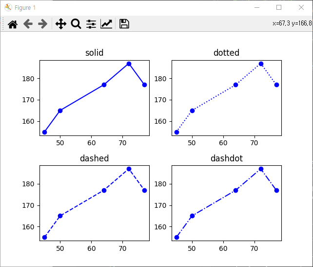 주로 사용하는 선 종류는 아래 네가지입니다. plot 메소드 내부에 linestyle 옵션으로 설정합니다.