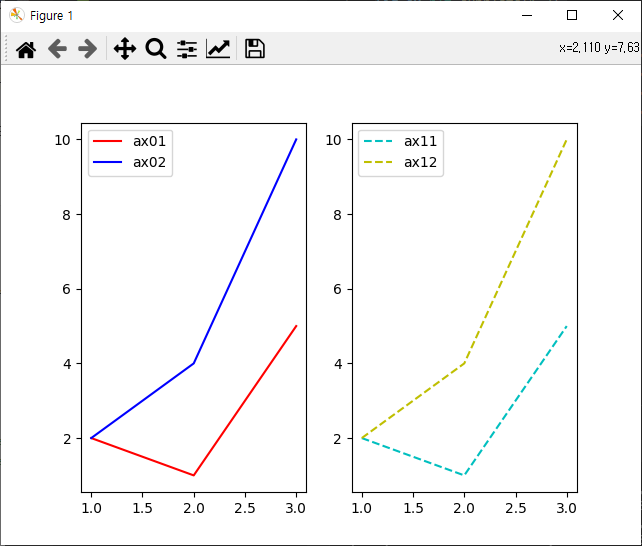 화면을 분할하여 여러개의 그래프를 그린 경우 범례를 넣는 방법을 예시를 통해 알아봅시다.