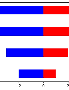 [파이썬 matplotlib] back-to-back 막대그래프 back-to-back 막대그래프를 그리는 방법은 plt.bar 그래프를 2개 그릴 때, 두번째 그래프의 data 값의 부호를 음수로 입력해주는 것입니다. back-to-back 그래프는 보통 수평형으로 만들어줍니다. 수평형을 만들때는 barh 메소드를 사용합니다. import matplotlib.pyplot as plt X=[1,3,5,7]data1 = [1,2,3,4]data2 = [-2,-3,-4,-5]plt.barh(X, data1,color='r')plt.barh(X, data2,color='b') plt.show() 넘파이 array를 사용하면 더 편하게 입력이 가능합니다. 처음부터 음수인 데이터가 아니기 때문에 리스트에서 각 값..