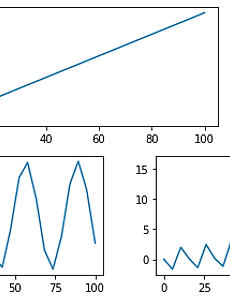 [파이썬 matplotlib] 한 화면에 그래프 여러개 그리기 (subplots 이용) 한 화면에 그래프를 여러개 그래는 방법은 아래의 네가지 방법이 있습니다. 1) subplot2grid2) subplots 3) subplot4) add_subplot 이번 글에서는 subplots 를 이용하는 방법을 알아봅시다. 아래 그래프를 통해 사용방법을 이해해봅시다. import numpy as npimport matplotlib.pyplot as plt X = np.linspace(0,100,20)Y1 = XY2 = X**2Y3 = np.sin(X) fig,ax=plt.subplots(nrows=2,ncols=2)ax[0,0].plot(X,Y1)ax[1,0].plot(X,Y2)ax[1,1].plot(X,Y3) ..