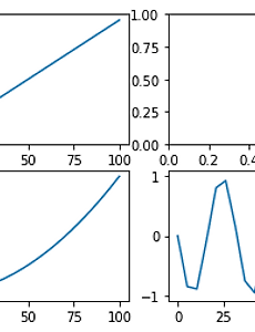 [파이썬 matplotlib] 한 화면에 그래프 여러개 그리기 (subplots 이용) 한 화면에 그래프를 여러개 그래는 방법은 아래의 네가지 방법이 있습니다. 1) subplot2grid2) subplots 3) subplot4) add_subplot 이번 글에서는 subplots 를 이용하는 방법을 알아봅시다. 아래 그래프를 통해 사용방법을 이해해봅시다. import numpy as npimport matplotlib.pyplot as plt X = np.linspace(0,100,20)Y1 = XY2 = X**2Y3 = np.sin(X) fig,ax=plt.subplots(nrows=2,ncols=2)ax[0,0].plot(X,Y1)ax[1,0].plot(X,Y2)ax[1,1].plot(X,Y3) ..